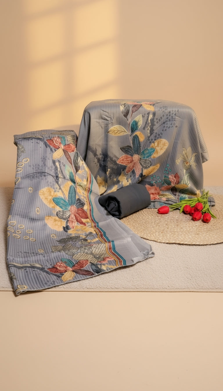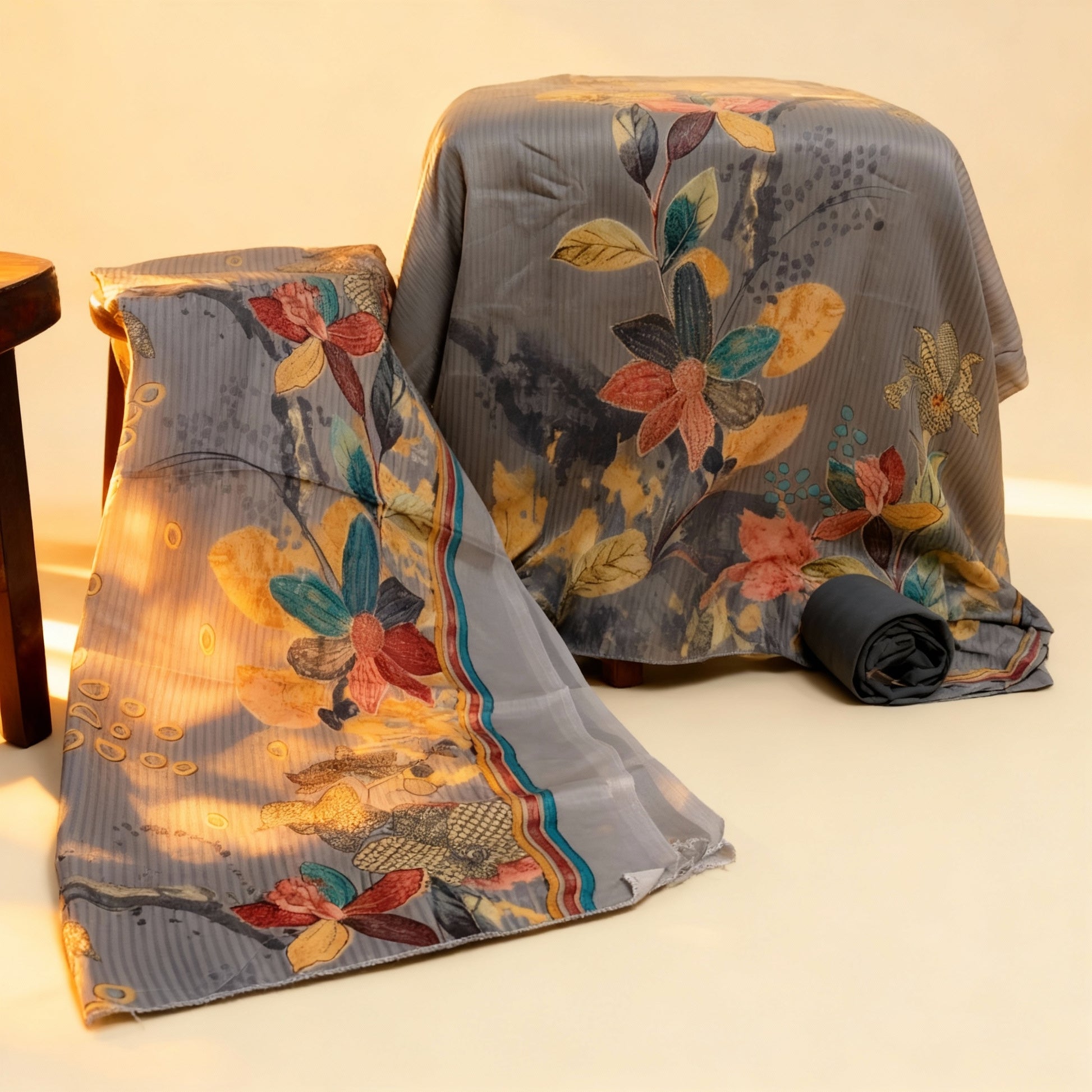 Where calm meets color — Aarvi celebrates subtle charm with a touch of artistry. Set against a soothing grey canvas, the fabric blooms with vibrant florals in shades of teal, mustard, red, and peach — a tribute to timeless elegance and modern grace.