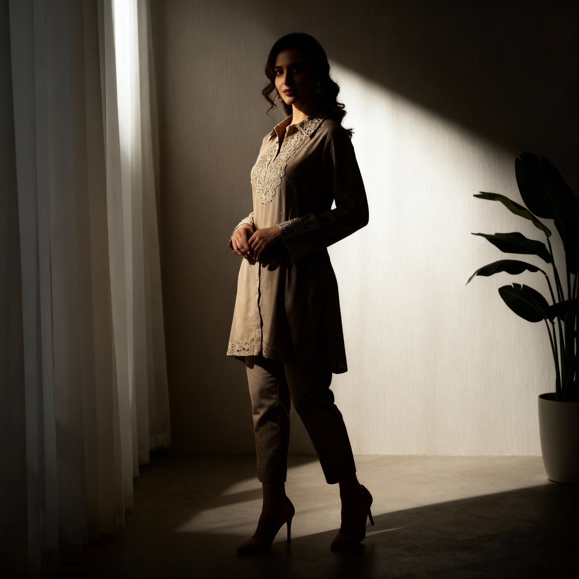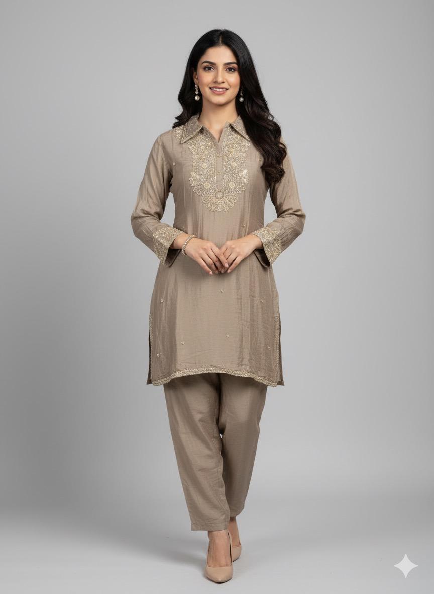 Soft, subtle, and effortlessly elegant — Amaira captures the art of understated sophistication. In calming tones of sand beige, this ensemble is adorned with delicate lace detailing on the collar, cuffs, and hemline — adding just the right touch of femininity and refinement.