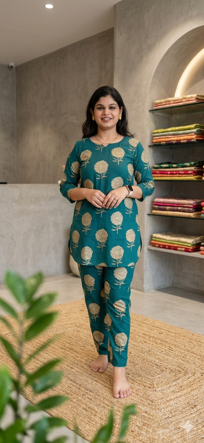 Crafted in a rich emerald green tone, this set features delicate gold floral motifs that add a subtle festive charm while keeping it perfect for everyday wear. The straight-fit kurta paired with comfortable pants creates a flattering silhouette thatβs both relaxed and stylish.