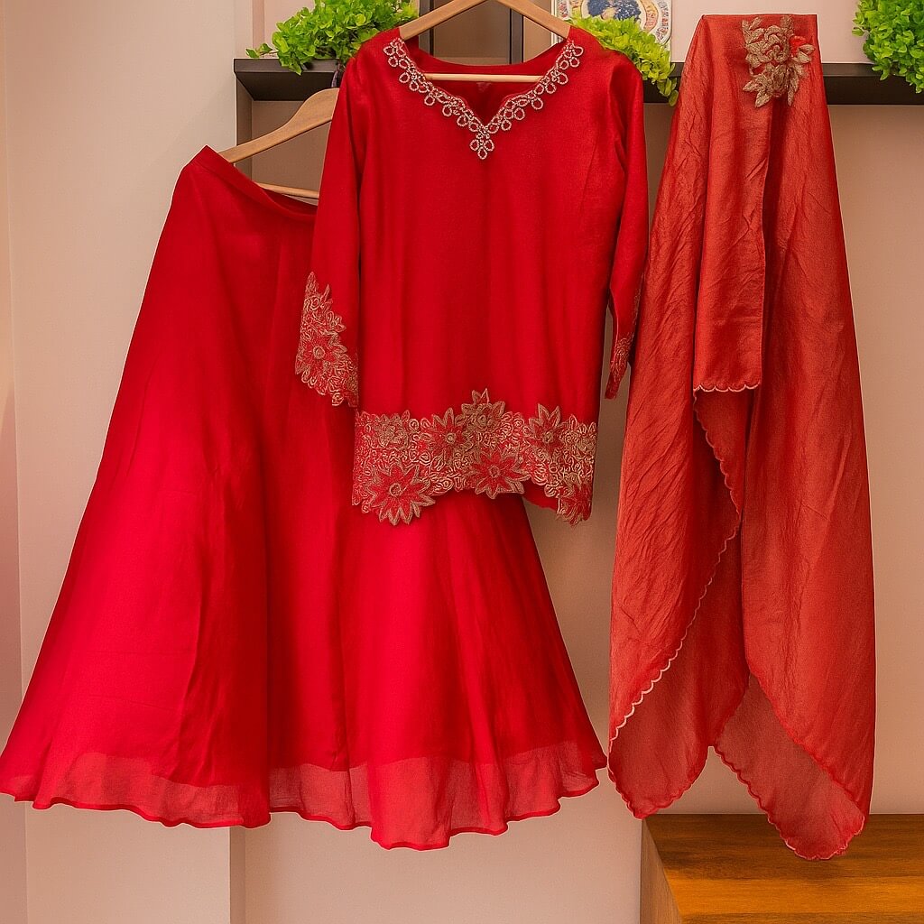 Inara embodies festive luxury with a touch of timeless grace. Crafted in rich red silk blend fabric, this elegant three-piece set features an intricately hand-embroidered kurta with mirror and zari detailing along the neckline, sleeves, and hemline. The flared palazzo adds fluid movement, while the matching dupatta with delicate embroidery completes the look.