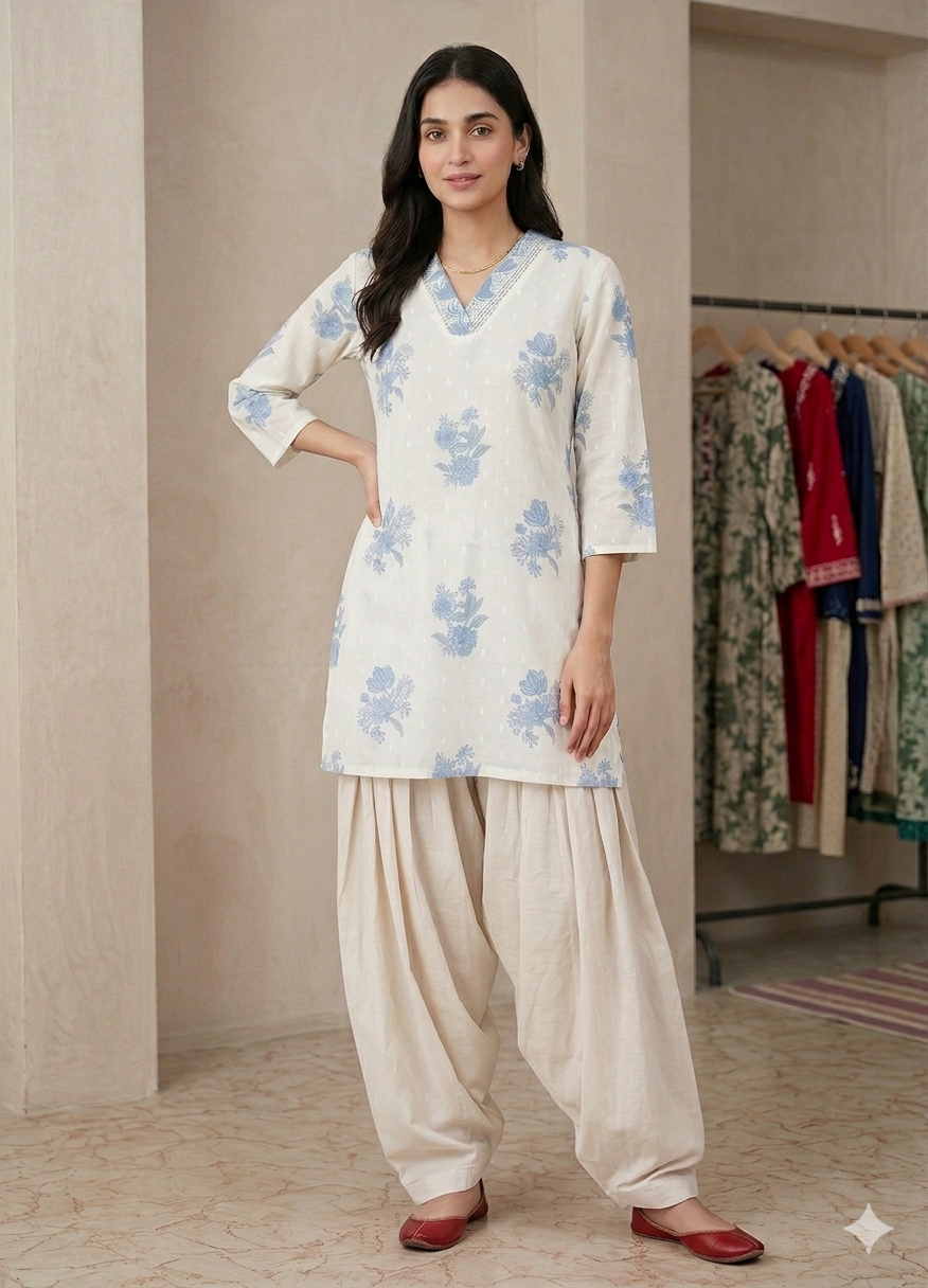 Soft, graceful, and effortlessly elegant — the Ivory Bloom Dhoti Set is your go-to for understated charm. The soothing ivory base adorned with delicate blue floral prints brings a fresh, calming vibe, while the V-neck kurta with three-quarter sleeves adds a touch of sophistication. Paired with relaxed dhoti-style bottoms, this outfit blends comfort with contemporary ethnic style. Perfect for brunch dates, casual gatherings, or festive days when you want to keep it light yet stylish 💙