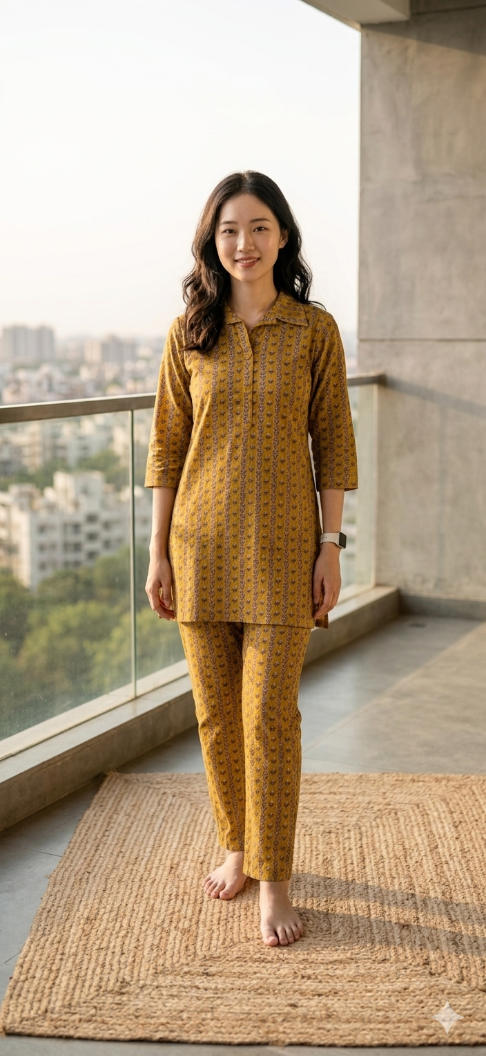 Designed in a warm mustard hue with subtle vertical prints, this set brings a perfect blend of simplicity and statement. The straight-fit kurta paired with matching pants creates a clean, structured silhouette that flatters effortlessly.