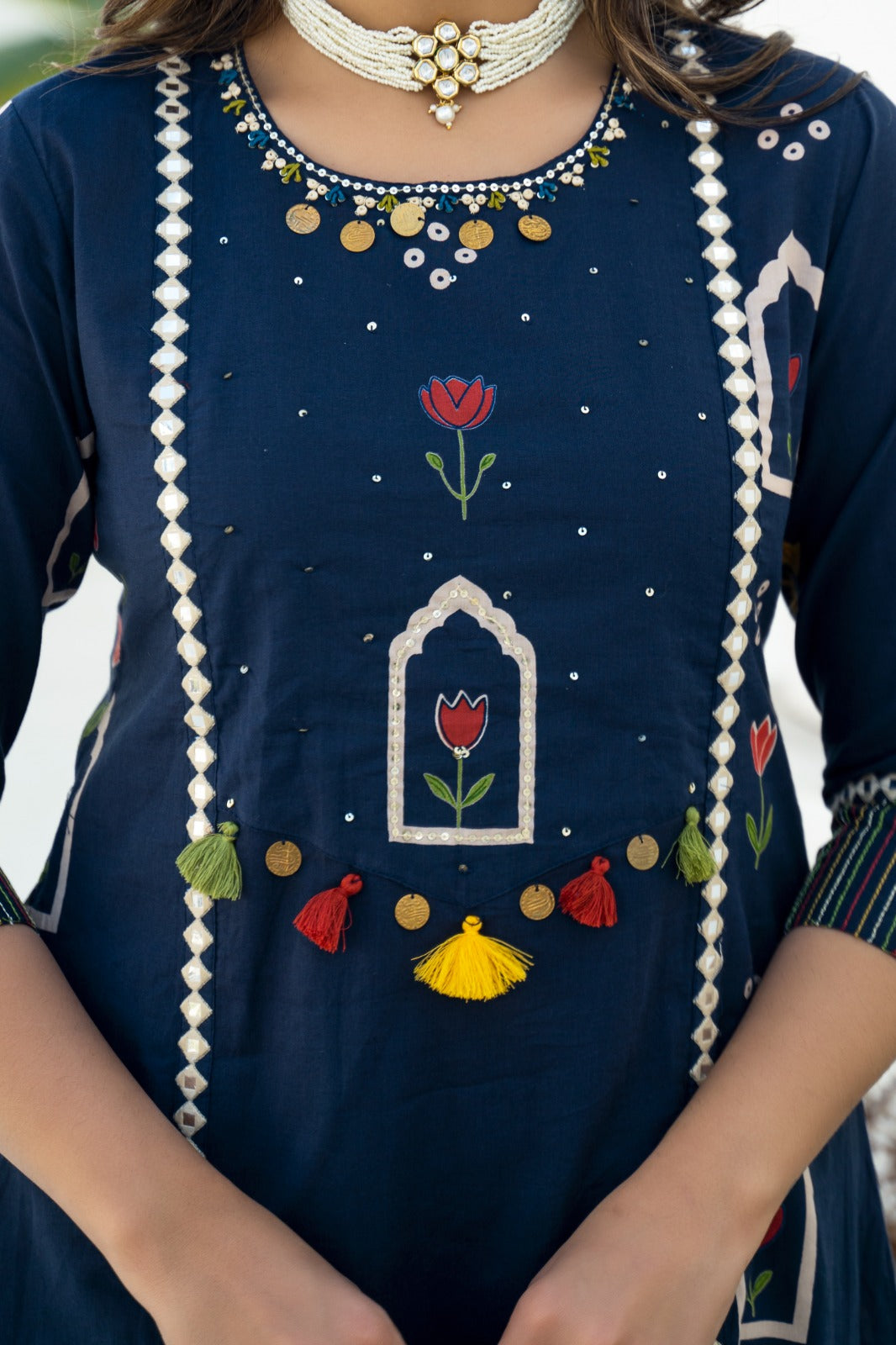 Elegant, timeless, and effortlessly graceful ā the Noor Navy Suit Set is crafted in a rich deep navy hue that exudes sophistication. Adorned with delicate floral and niche-inspired motifs, the kurta features intricate detailing along the neckline and vertical panels, creating a flattering and elongated silhouette.