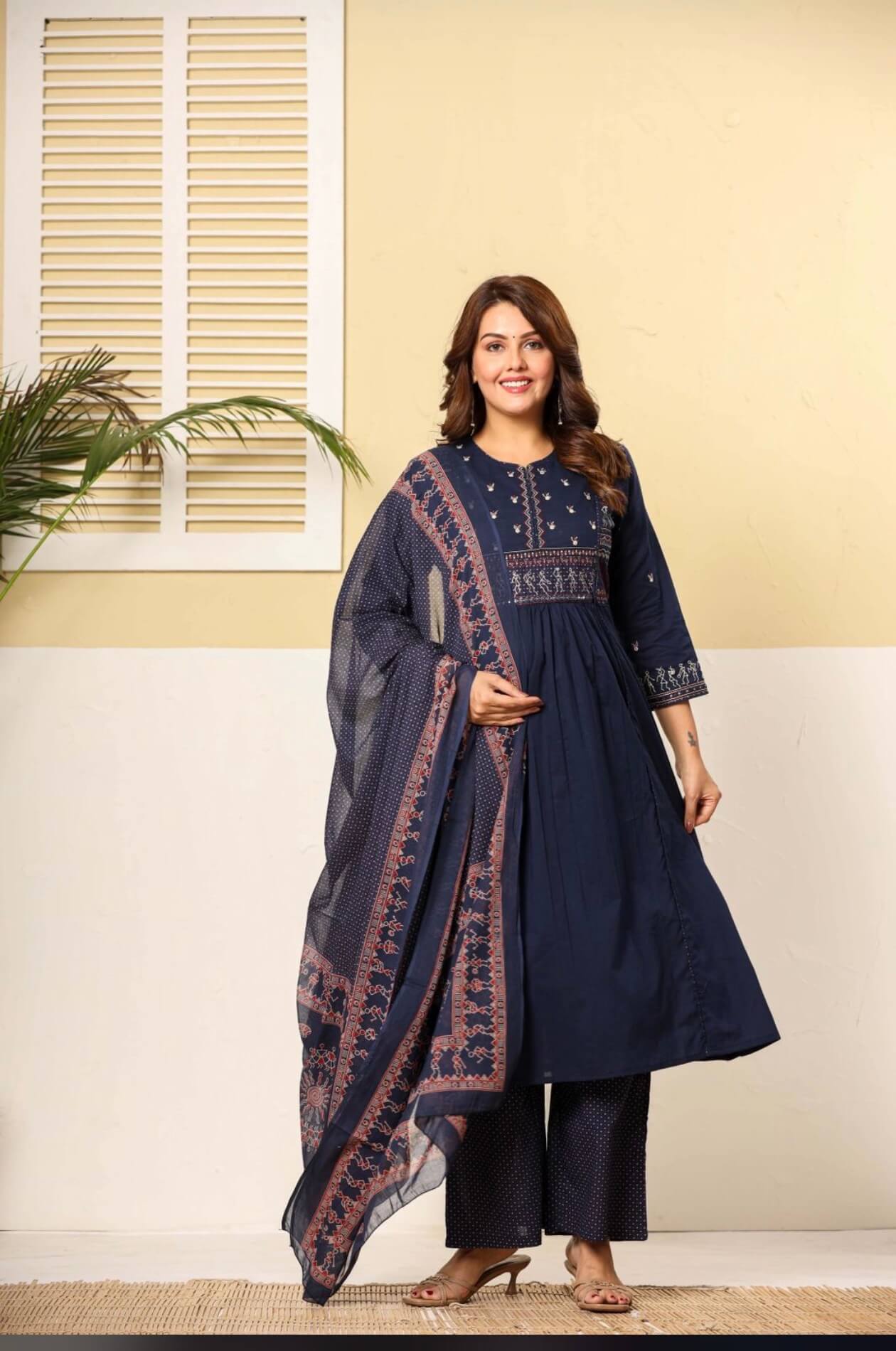 - Kurta: Empire-cut with embroidered yoke and 3/4th sleeves