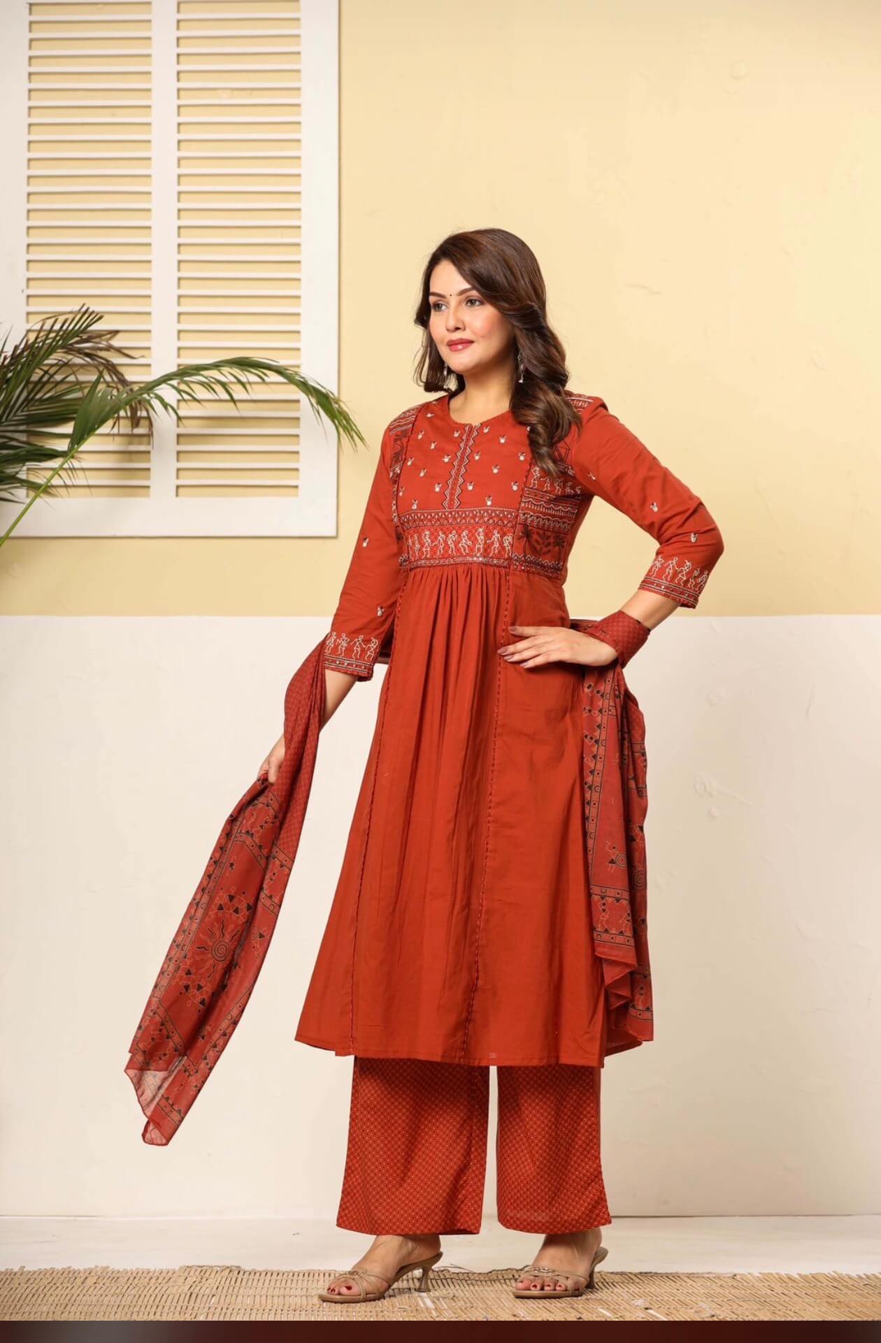 Grounded in tradition, Ruhani captures the soul of handcrafted beauty. This rust-hued cotton set features delicate hand-inspired embroidery on the yoke and sleeves, paired with matching wide-legged pants and a printed dupatta that adds a rustic charm.