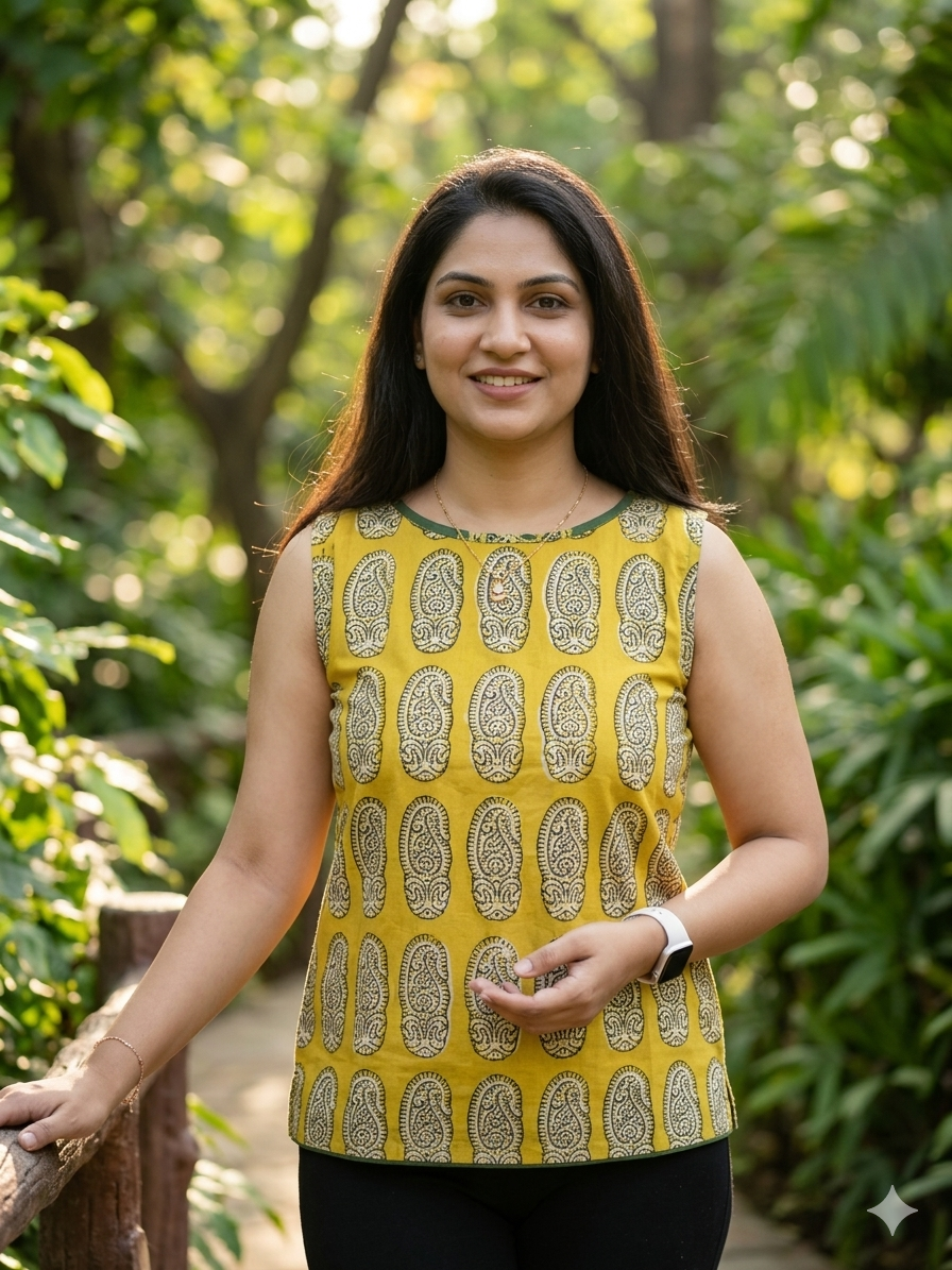 Bright, breezy, and effortlessly stylish. This sleeveless top in a vibrant yellow hue is adorned with classic paisley motifs, giving it a fresh yet rooted feel. Perfect for summer days, easy layering, and everyday comfort with a touch of elegance.